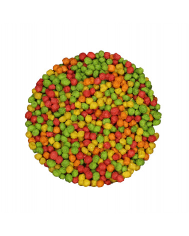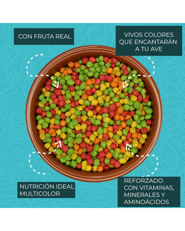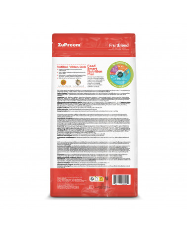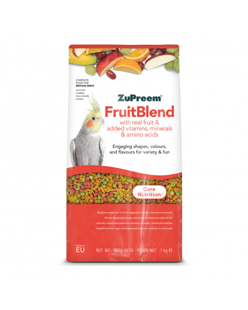 Alimento completo para pájaros. FruitBlend con frutas reales es un alimento diario completo para aves de compañía que proporciona cada día una nutrición saludable y deliciosa a pájaros de tamaño medio, incluidos cacatúas ninfa, agapornis, cotorras pequeñas, cotorras argentinas y otros pájaros de tamaño medio que prefieren gránulos de este tamaño.